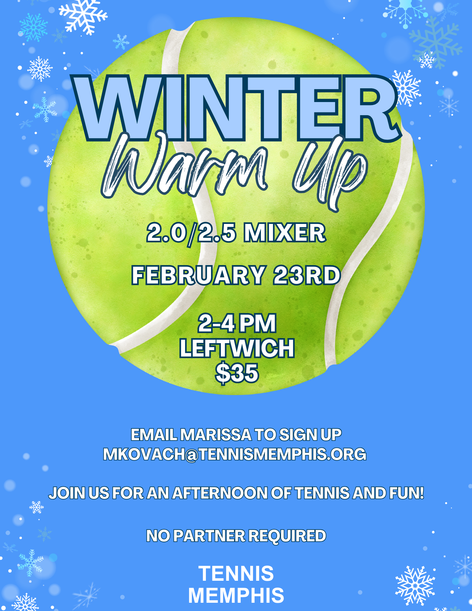 Coed Partner not required for sign up Price: $35 Time: 2-4pm Maximum 30 people Email Marissa mkovach@tennismemphis.org to sign up. mkovach@tennismemphis.org