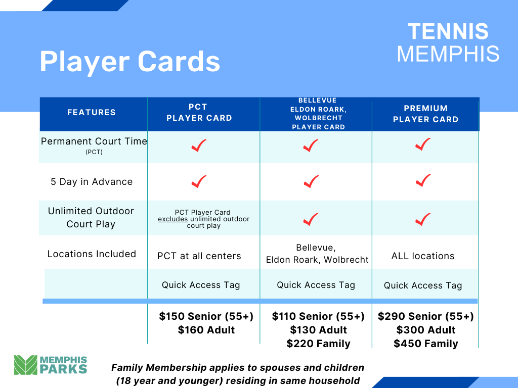 Players electing to purchase a Player Card may choose from one of our three options. They are outlined below. Please login to you account and to make a purchase. If you have issues logging in please email tmoffice@tennismemphis.org for additional assistance.